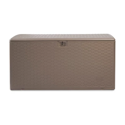 - 99-gallon resin storage deck box that is perfectly designed to store outdoor accessories, cushions, tools, pool toys, and more