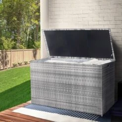 Teamson Home Wicker 154 Gallon Outdoor Deck Box For Cushions Storage, Gray